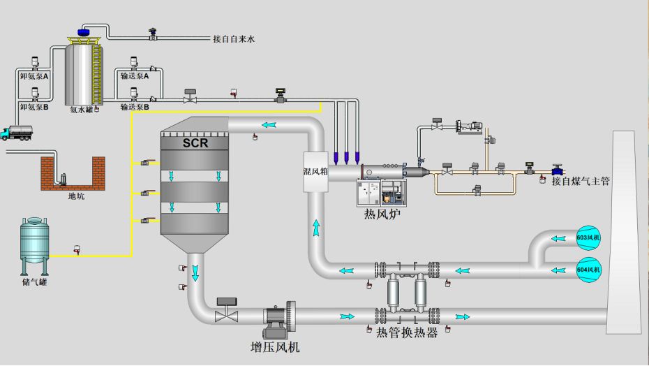 本項(xiàng)目的主要工程內(nèi)容為:新增1臺(tái)熱管換熱器、1臺(tái)熱風(fēng)爐,1臺(tái)中溫SCR反應(yīng)塔,1臺(tái)增加風(fēng)機(jī),1套氨水儲(chǔ)存系統(tǒng)、配套的電氣、儀表、土建、煙道、防腐、保溫等。